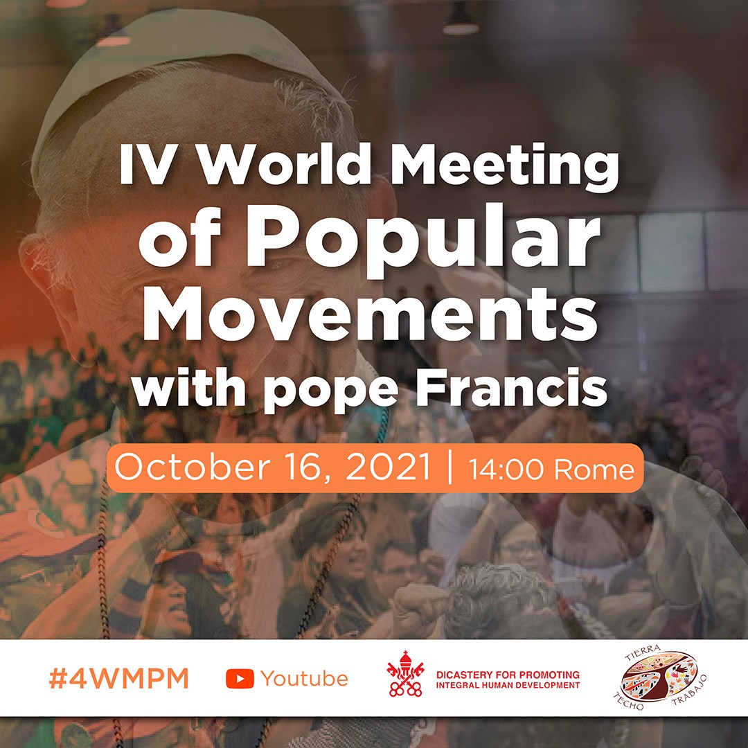 This second part of the IV World Meeting of Popular Movements (IV EMMP) will take place on Saturday, October 16 at 14h (CEST) and will feature an intervention by Pope Francis, who will deliver a message to the participants. The transmission of this meeting can be followed through the social networks and channels of the Popular Movements and through the Vatican YouTube channels of Vatican News and the Dicastery for Promoting Integral Human Development.