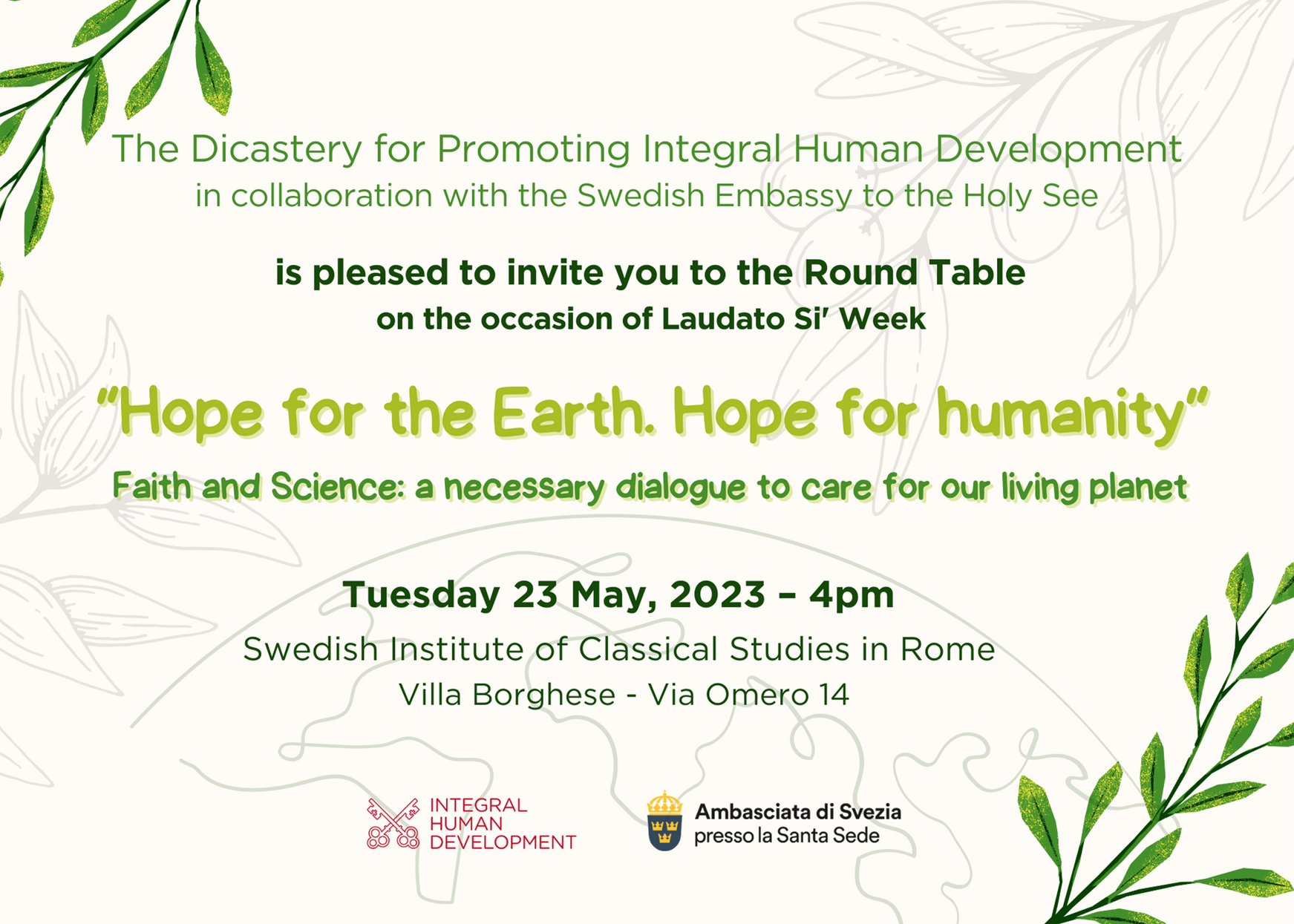 The Dicastery for Promoting Integral Human Development and the Swedish Embassy to the Holy See are promoting a Round Table on the theme "Hope for the Earth. Hope for Humanity. Faith and Science: a necessary dialogue to care for our living planet" to be held on May 23, at the Swedish Institute of Classical Studies in Rome's Villa Borghese. The event is part of Laudato si' Week, which celebrates the 8th Anniversary of the publication of Pope Francis' Encyclical this year and aims to highlight the need for a fruitful dialogue between theology and science, between the human needs and nature’s ones, between spiritual wounds and those caused to the environment. A dialogue understood as a crucial generative experience, an experience of hope and collaboration.