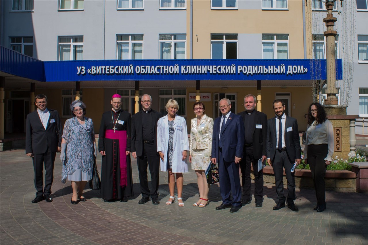 The XV International Medical Conference n the theme "Problems of medical ethics in the contemporary world" was organized by the Diocese of Vitebsk in the Republic of Belarus. Before the conference officially began, on 6 June, a small entourage of participants joined His Excellency Bp. Aleh Butkevich, Bishop of Vitebsk, at a local hospital that is still under construction. Bishop Butkevich blessed a new room that will become the future chapel of this hospital. Next, the group traveled to the Vitebsk Regional Maternity Hospital where the Director, Dr. Alena Leonovich, conducted a tour of the facility. It is the largest maternity ward in the region, with around 2,500 children born there each year.