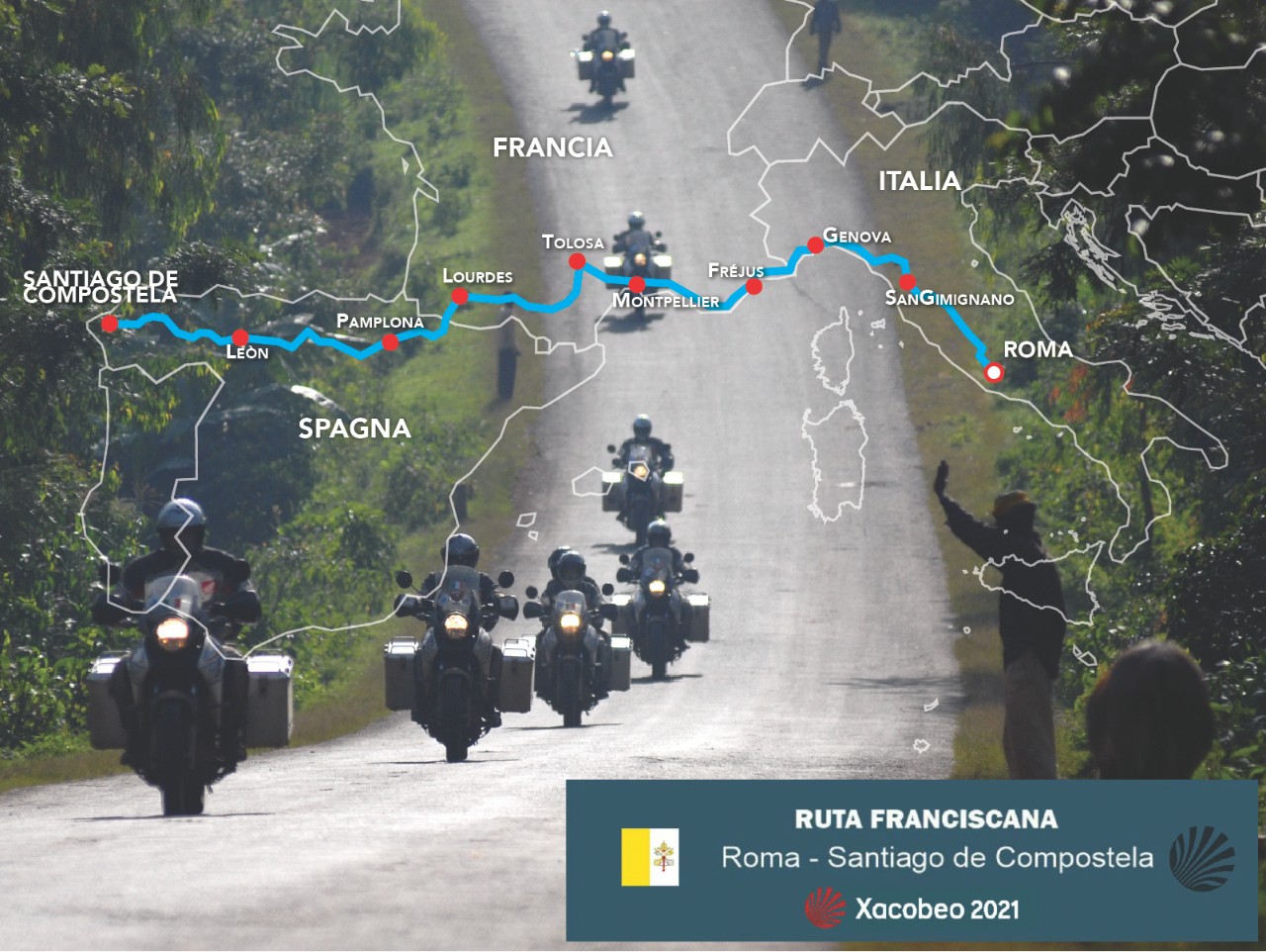 Esta peregrinación a Santiago de Compostela organizada por MotoForPeace para rendir homenaje al Apóstol Santiago con motivo del año XACOBEO 2021, partiendo de Roma y recorriendo la RUTA FRANCISCANA, finalizará en la Plaza del Obradoiro, en la Catedral de Santiago de Compostela, el 25 de julio, día del Apóstol Santiago. Pero este viaje es también la fase preparatoria de la misión "Anónimos en la fe nº 3" que tendrá lugar en Eurasia en 2022.