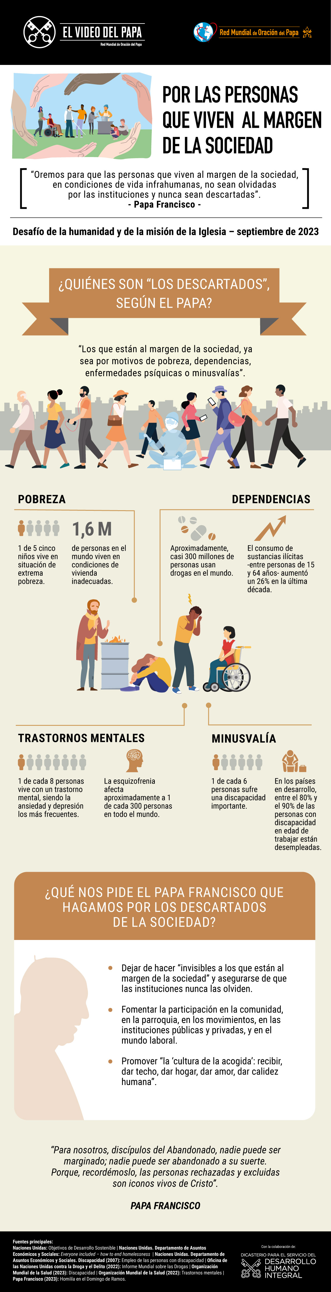 En el mes de septiembre de 2023, Francisco invita a la oración y al compromiso por quienes “viven al margen de la sociedad”. El Dicasterio para el Servicio del Desarrollo Humano Integral, que tiene como misión la promoción de la persona humana con particular atención a los excluidos y a los invisibles, ha apoyado la Red Mundial de Oración del Papa con la realización de este vídeo, para difundir las intenciones de oración del Santo Padre.