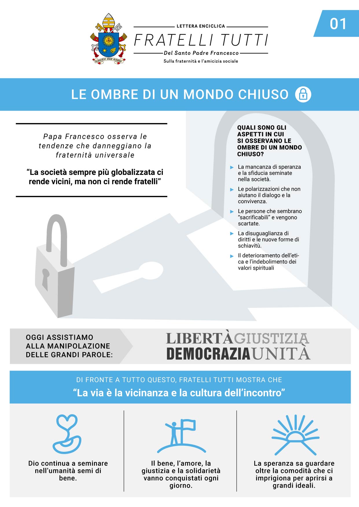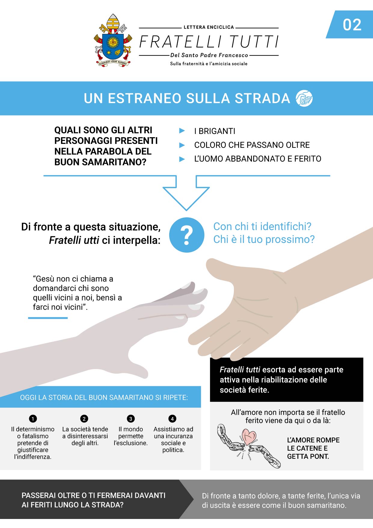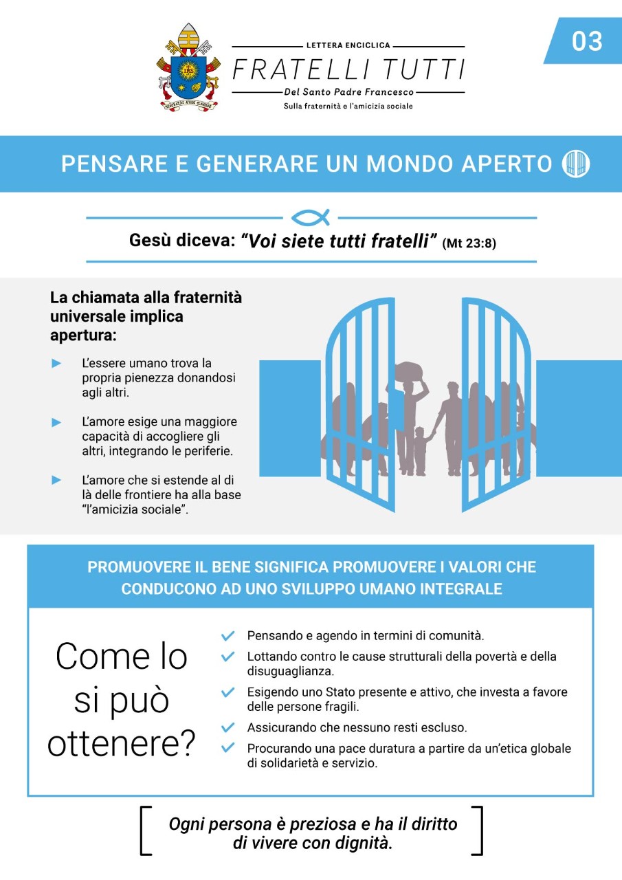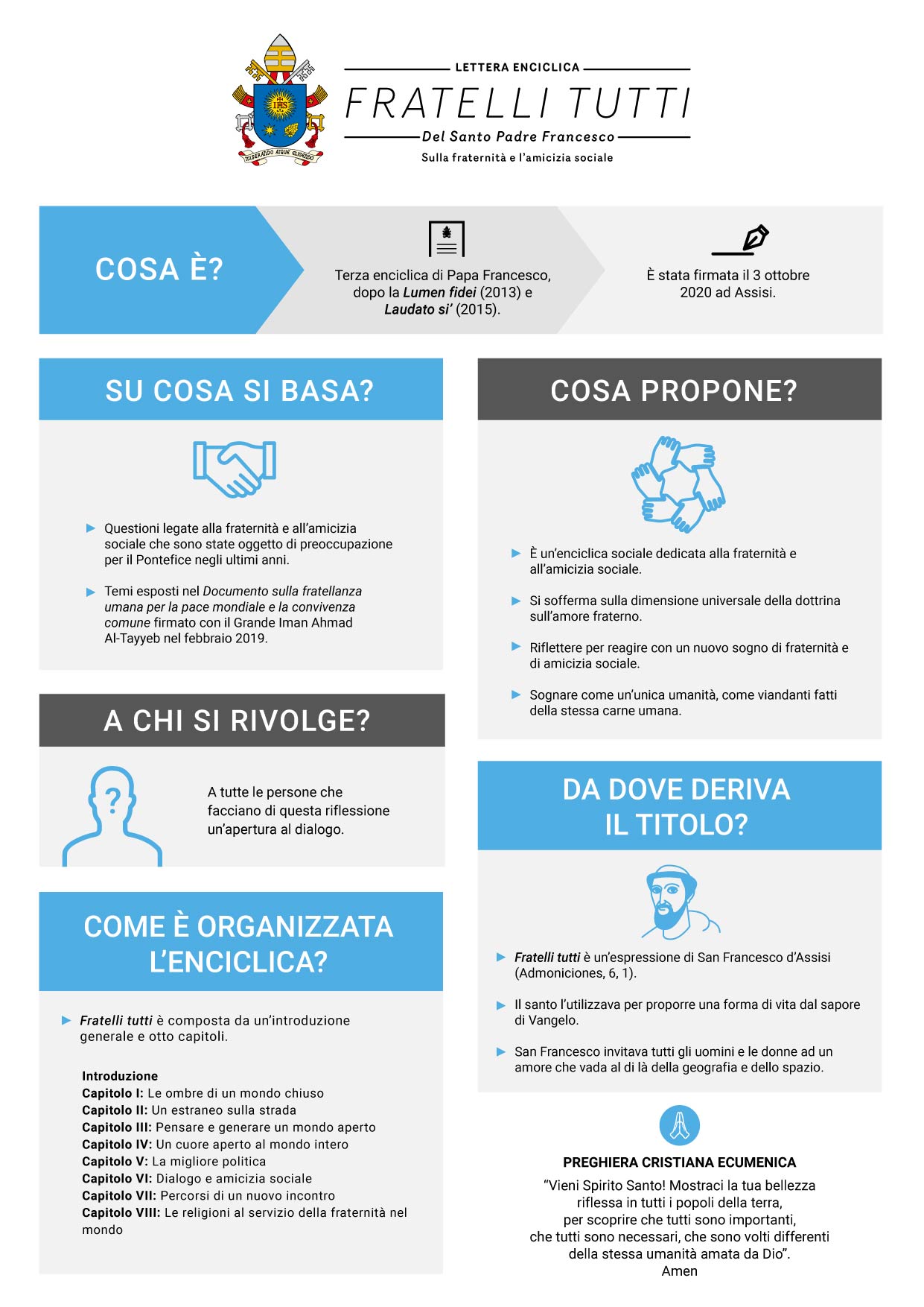 Qui sarà possibile leggere e scaricare le infografiche, semplici strumenti che aiutano a comprendere il testo di "Fratelli tutti" in maniera immediata e veloce, facendosi un'idea di massima del contenuto del testo stesso.