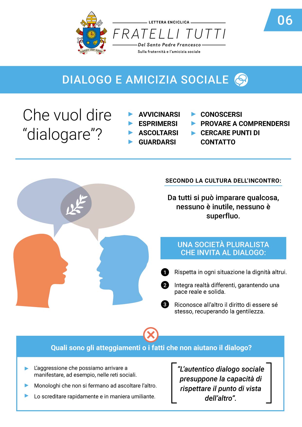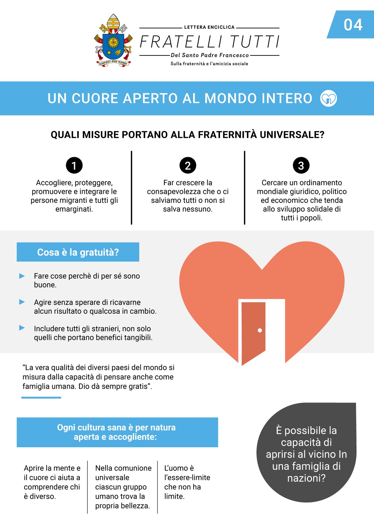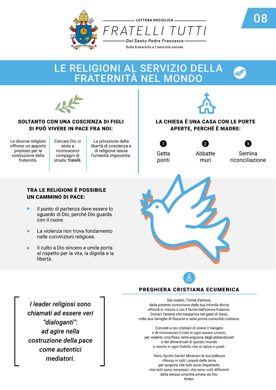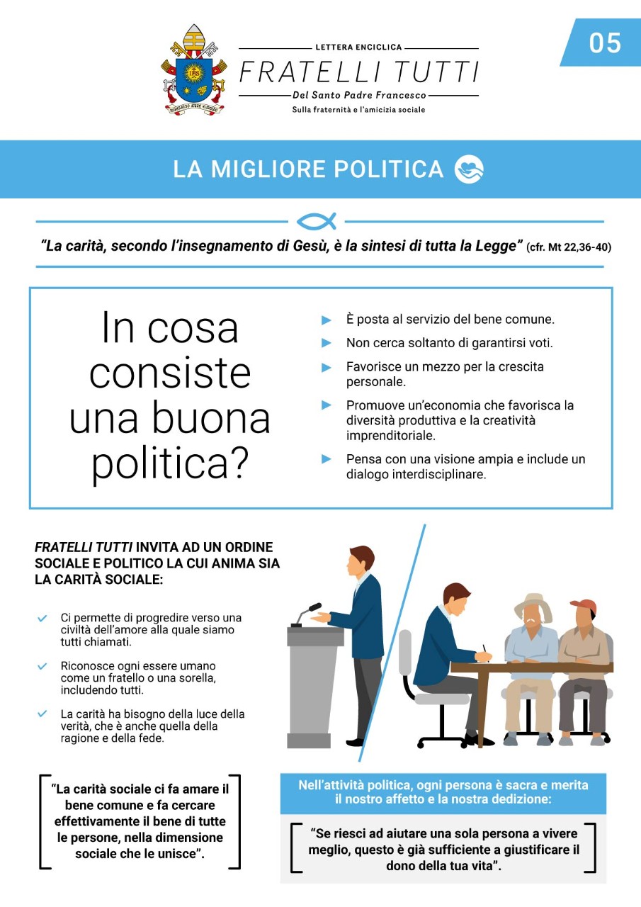 Qui sarà possibile leggere e scaricare le infografiche, semplici strumenti che aiutano a comprendere il testo di "Fratelli tutti" in maniera immediata e veloce, facendosi un'idea di massima del contenuto del testo stesso.